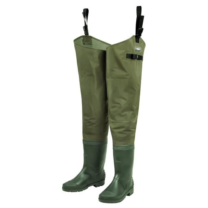 Cuissardes vertes, nylon et caoutchouc, 100% étanche, sangles de serrage ajustables.