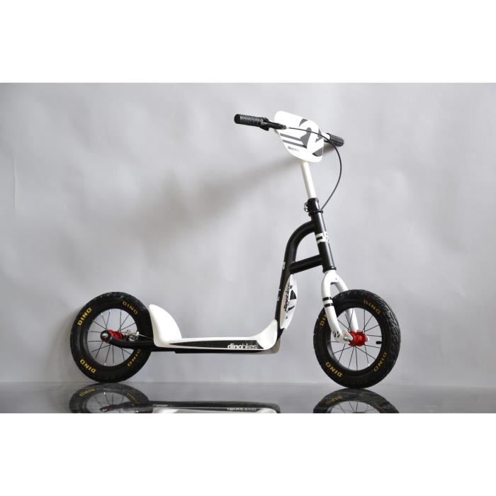 Trottinette Cross, noir et blanc, frein arriere, pneus sport gonflables, roues rayons, enjoliveur guidon, poignées PVC. A partir de 3 ans.
