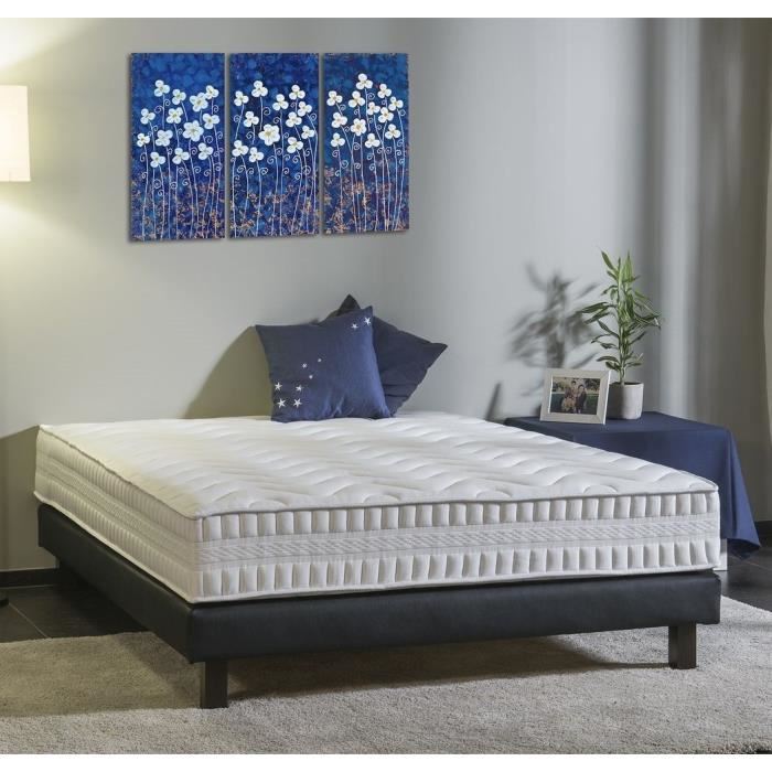 Ensemble 160x200cm : Matelas mousse polyurethane - Bloc de 17 cm - Densité 24 kg/m3 - Deux plateaux piqués sur 300 gr/m2 ouate thermofixée - Plate bande tricotée luxe et piquée - Coutil stretch 99% polyester 1% cachemire - 21cm au milieu du matelas - Sommier tapissier - Encadrement pin massif - h.12cm