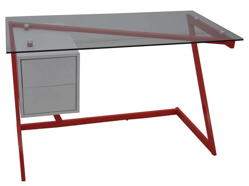 Craquez pour ce bureau au look carrément design.Son plateau en verre et sa structure en métal rouge en feront un élément de décoration à part entière.Vous apprécierez son vaste plan de travail et son caisson de rangement intégré qui vous permettra d'optimiser au mieux votre espace de travail.Caisson de tiroir en panneaux de particules recouverts de papier décor mélaminé blanc.