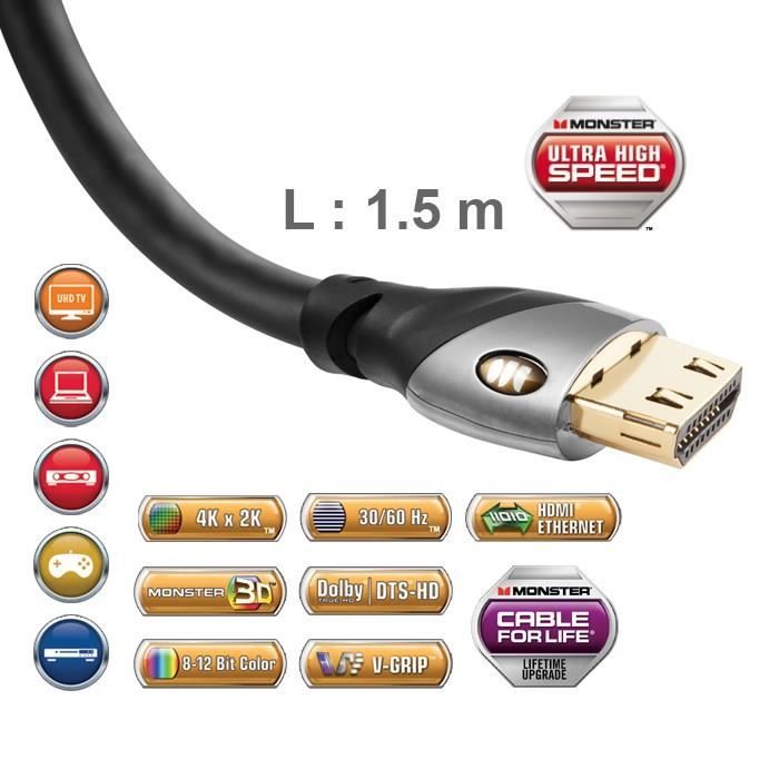 Câble Supérieur ? la norme HDMI 2.0 - L. 1,5 m - Ultra High Speed 22,5gbps - Compatible Ultra Haute Définition - Taux de rafraîchissement rapide de 50 Hz. Son 7.1 sans perte - Jacket Duraflex: résiste aux hautes températures - Connecteur V-Grip - Contact en alliage or 24 carats - Mise et Garantie ? vie