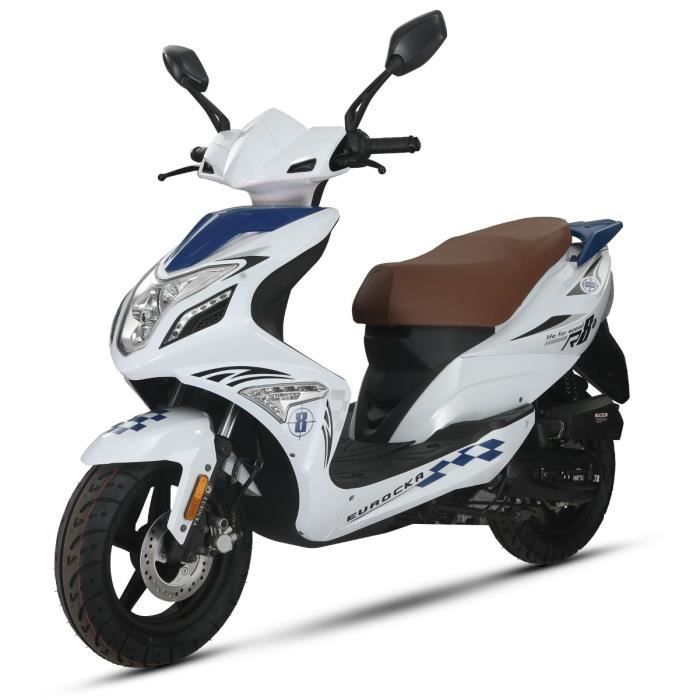 Scooter 50cc Bleu - homologué route - 2,1kW a 7500 rpm - jantes alu 12" - démarrage kick/électrique - freins avant et arriere a tambour - Fourche hydraulique a l'avant - amortisseurs a l'arriere - vitesse max : 45km/h - Garantie : 1 an apres date d'achat