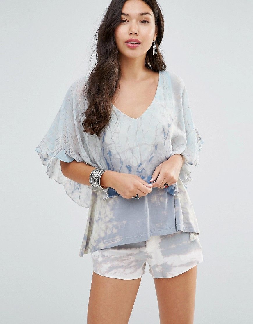 Top par Gypsy 05, Coton stretch, Modèle léger, Imprimé sur l'ensemble, Encolure en V, Effet de superposition, Coupe ample au tombé lâche, Nettoyage à sec, 93% coton, 7% spandex, Le mannequin porte l'article en taille UK S / EU S / US XS.