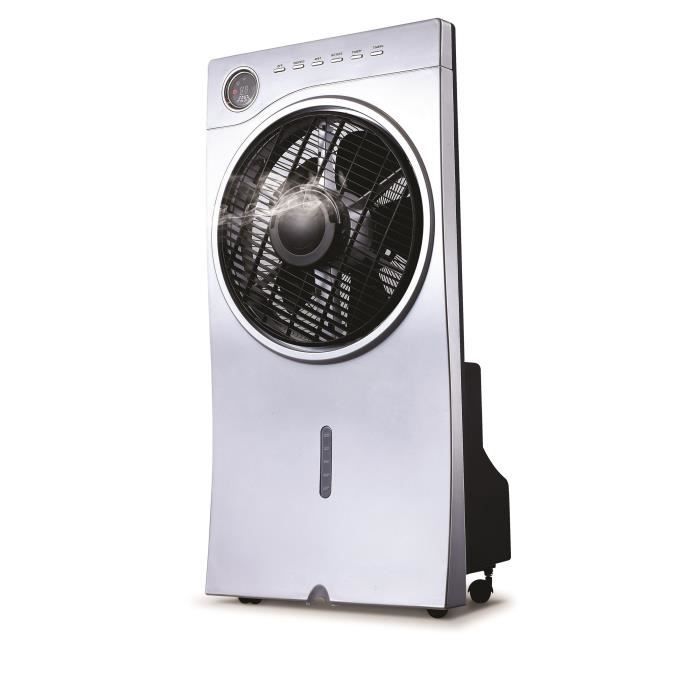 Brumiventilateur - Puissance 85 W - Débit d'air 3189 m3/h - Réservoir 2.5 L - 3 vitesses - Vitesse de l'air 6m/s - Rotation de la grille a 360° - Niveau sonore 43.4 dB - Minuterie 9h - 3 modes (normal, naturel, nuit) - Télécommande - 4 roulettes - Alarme réservoir vide - Coloris argent satiné -