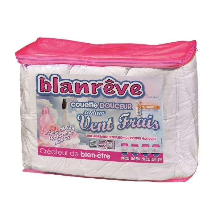 BLANREVE couette VENT FRAIS 400g/m² 200x200cm - Enveloppe 100% coton senteur "linge propre" - Garnissage 100% polyester siliconé creux 400g/m² - Piquage lignes - Finition biais coton - Livré sous valisette cristal + encart - Fabrication Française