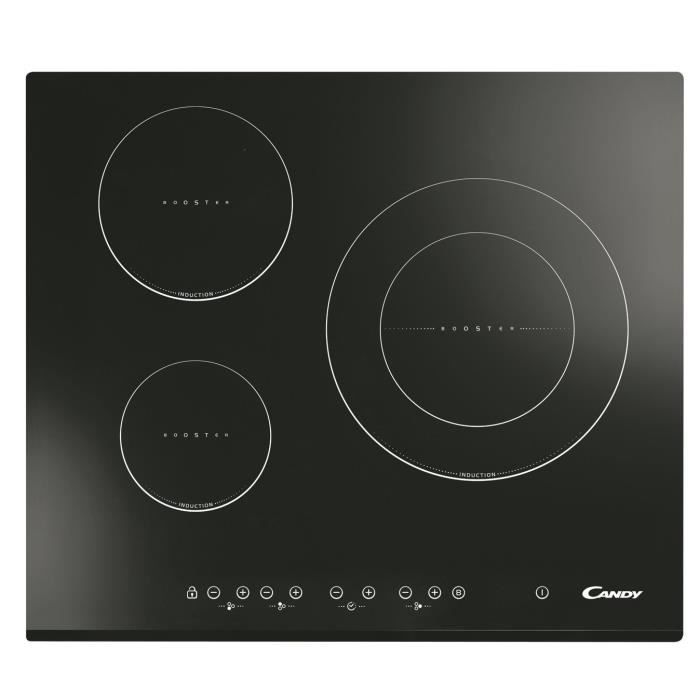 Table a induction - Largeur 59 cm - 3 foyers + 3 boosters dont 1 de 3700W - Puissance totale : 7200W - 1 minuteur fin de cuisson 99 min - Commandes sensitives individuelles - 10 niveaux de sécurité - 1 grand foyer de 28cm -