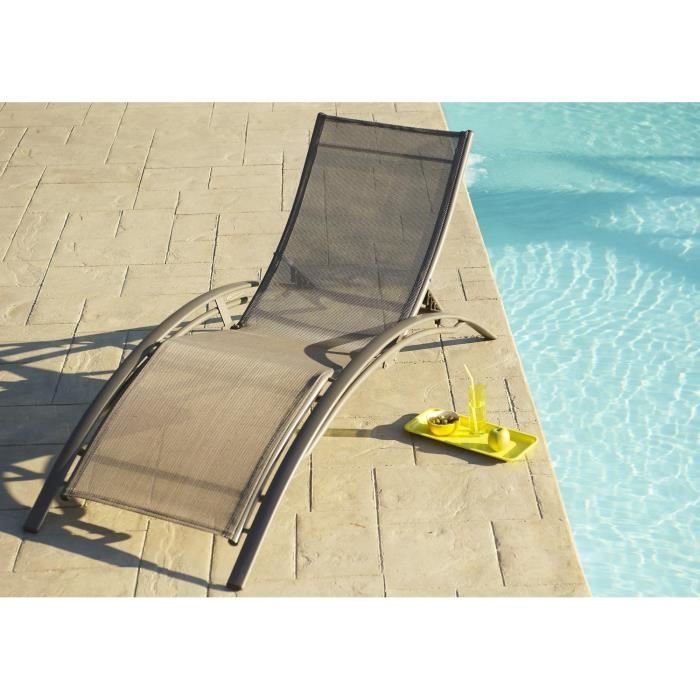 Chaise longue aluminium et textilene - Coloris : cappuccino - Armature : aluminium - Assise et tétiere : textilene - Dimensions : L 170 x l 70 x H 30 cm.