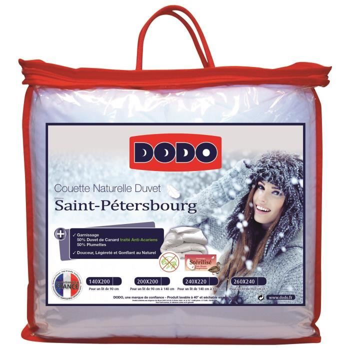 DODO Couette chaude duvet ST PETERSBOURG 200x200cm - Enveloppe 100% Coton percale supérieure - Garnissage 50% duvet de canard (flocons et fibres) traité anti-acariens et 50% plumettes - 400 gr/m² - Fabrication Française.