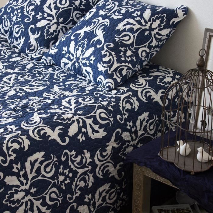 Couvre lit + 2 taies d'oreillers en microfibre légere marine et blanc. Tissu 100% polyester qui ne nécessite pas de repassage. Motif de charme style baroque. Lavable a 30°. Dimensions couvre lit 230x250cm, taies 65x65xcm.
