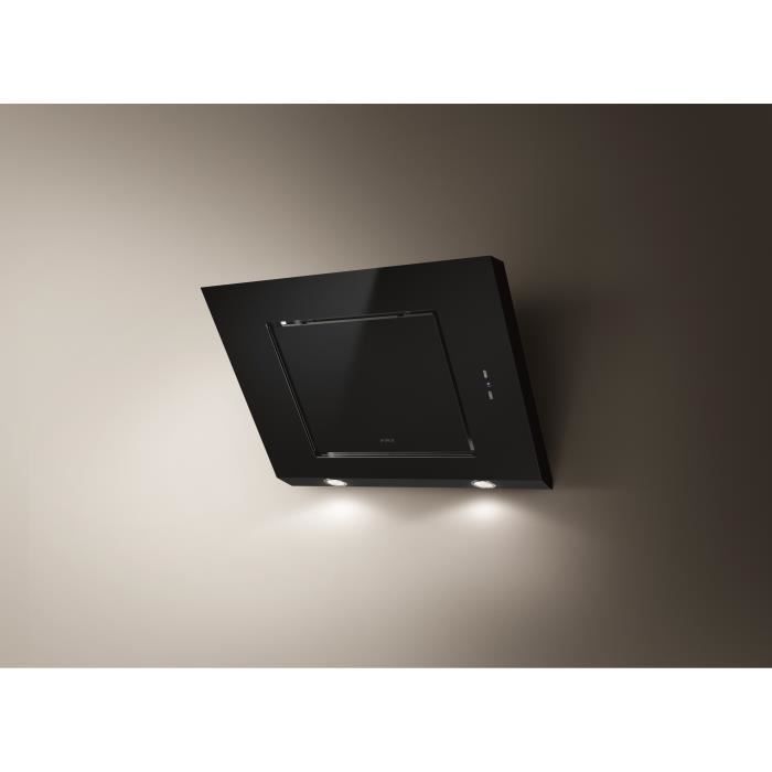 Hotte décorative murale - Largeur 80 cm - Débit maximum d'air : 647m3/heure - 3 vitesses + booster - Niveau sonore 45 a 63 dB - Touches électroniques avec écran - Filtre a charbon - Eclairage halogene 2x20W - Coloris noir -