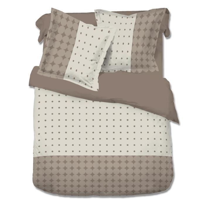 Parure de lit AIJA 100% coton comprenant 1 housse de couette 220x240cm et 2 taies d'oreiller 65x65cm a volant plat. Coloris : beige clair et beige foncé. Fermeture a boutons. Tissage serré : 57 fils/cm² et lavable a 40°.