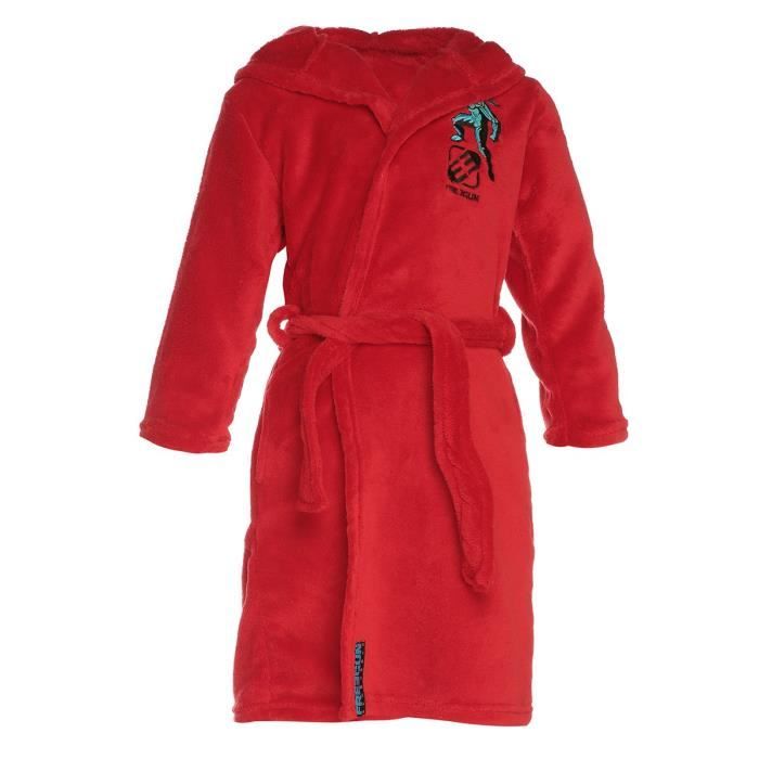 Peignoir rouge, ceinture a la taille. 100% coton. Manches longues.