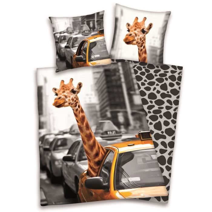 Parure de Couette NEW YORK GIRAFE comprenant 1 housse de couette 140x200cm et 1 taie d'oreiler 65x65cm - Composition : 100% COTON - Lavable a 60°C