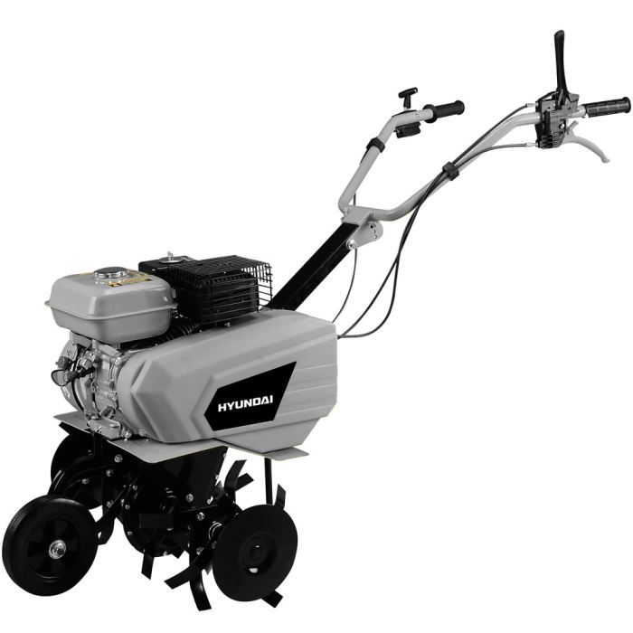 Motobineuse thermique 1 marche avant et 1 marche arriere, parfaitement adaptée aux potagers des particuliers car légere (50 kg) et donc facilement maniable. 4 fraises démontables (largeur 28 cm, épaisseur 3 mm), largeur de travail 52 cm, transmission démontable par courroie et chaîne, guidon réglable hauteur 4 positions, roue avant escamotable pour déplacement aisé de l'appareil, moteur 4 temps 163 cm3 (démarrage manuel par lanceur), capacité réservoir carburant 1,6 litres, capacité réservoir huile 0,35 litres.