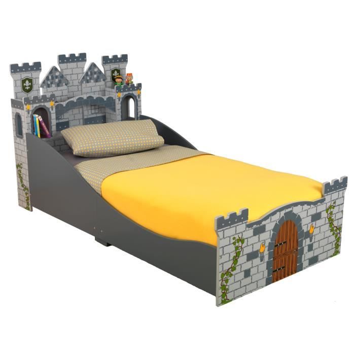 Le lit château médiéval pour enfant (155x80x80 cm) est coloré et amusant. Son profil bas permet un acces facile pour les enfants, et les panneaux latéraux surélevés renforcent la sécurité. La construction est a la fois astucieuse et robuste. Couchage 70x140 cm - Mixte - A partir de 18 mois.