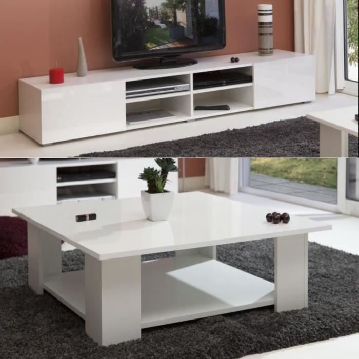 LIME Salon complet laqué blanc 2 pieces 1 meuble TV 185cm + 1 table basse carrée