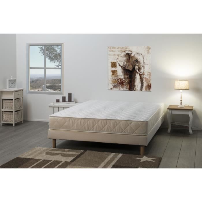 Matelas mousse mémoire - 18cm d'épaisseur : 13cm de mousse polyuréthane, densité 24kg/m3 et 3cm de mousse mémoire, densité 55kg/m3 - Zones de confort profilées - Deux plateaux piqués sur ouate - Plate bande piquée - Coutil 53% polyester / 47% polypropylene - Hauteur 18cm au milieu du matelas - 140x190cm