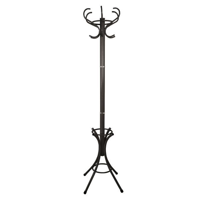 Porte manteaux en acier epoxy noir, type bistrot, stable sur 4 pieds avec 8 branches d'accrochage, anneau porte parapluies, caches de protection en polyamide noir, et bagues chromées