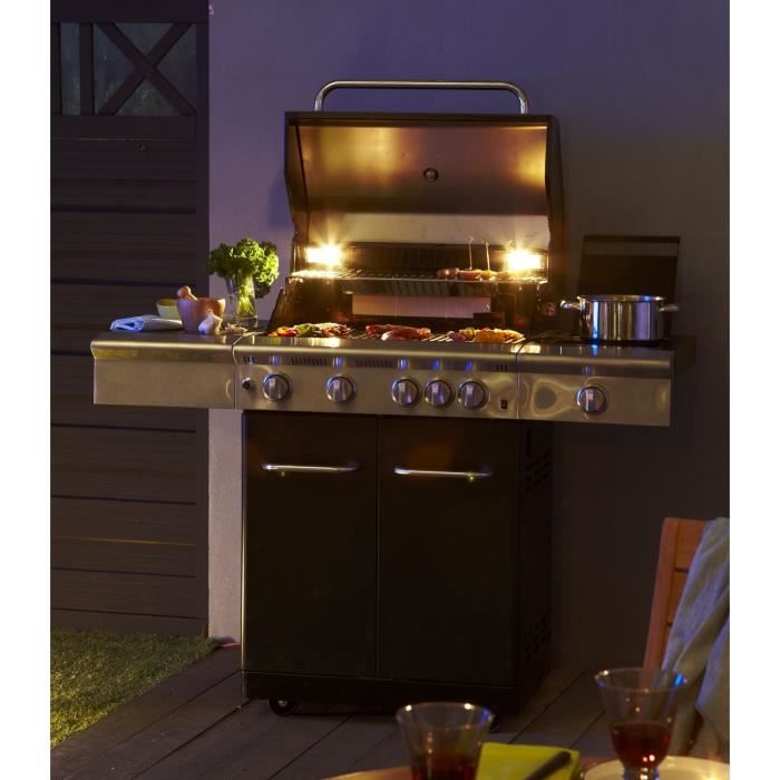 4 brûleurs en inox+side+1 brûleur céramique - Puissance 21,5 kWh - 2 Grilles de cuisson+1 grille d'attente inox - 1 plancha en fonte émaillée - Surface : 68 x 43 cm - Thermometre - 2 lampes -2 portes- 4 roues - Raccord a visser G ? - Vendu sans tuyau ni détendeur - Coloris : noir.