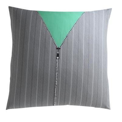 Un imprimé zip surprenant sur un fond gris faussement sage !DESCRIPTIF.Taie d'oreiller carrée (forme sac) 1 face rayures verticales striées avec impression effet zip à moitié ouvert sur fond vert, 1 face rayures  verticales striées gris foncé sur fond gris clair. Taie de traversin i...