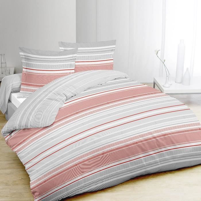 VISION parure de couette RAY comprenant 1 housse de couette 220x240cm + 2 taies d'oreiller 65x65cm a volant plat - Coloris : gris, rouge et blanc - Composition : 100% coton - Tissage serré : 57 fils - lavage a 40°
