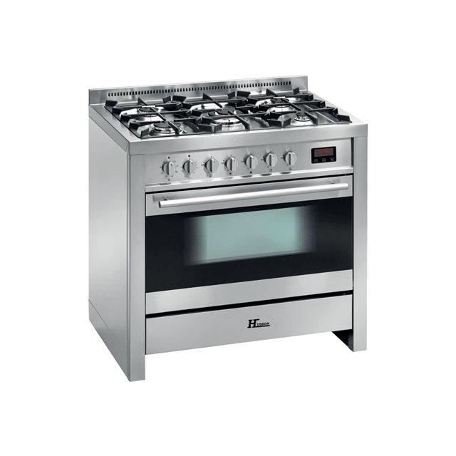 Cuisinière gaz - 5 foyers - Brûleur wok triple couronne - Valve de sécurité - Grille en fonte - 8 fonctions - Four : 104 L - Paroies cavité lisse avec grilles latérales - Programmateur Auto Digital Touch - Rotisserie - Tiroir - Coloris inox -