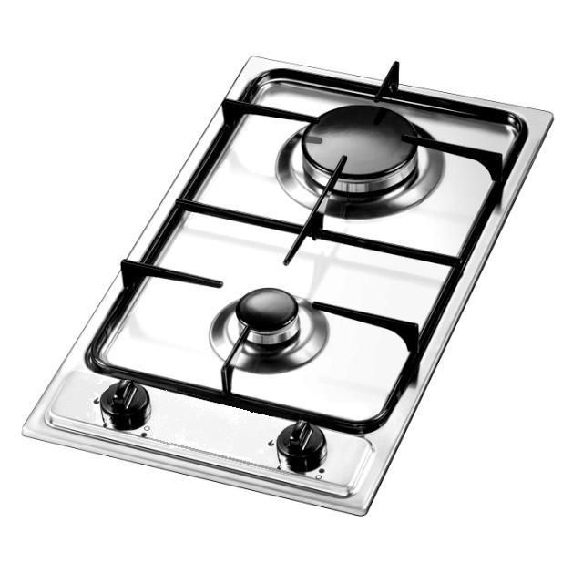 Domino Gaz - 2 foyers gaz - Thermocouple - Grille émaillée, chapeaux de br?leurs noirs - Allumage électronique 1 main - Commandes frontales - Cordon de raccordement 230 v - Coloris Inox