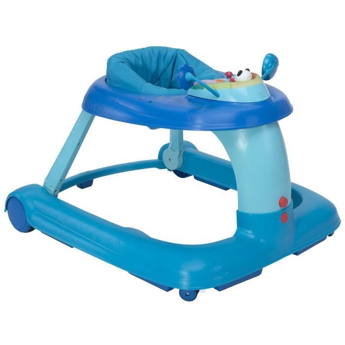 Trotteur 1 2 3, a partir de 6 mois. Evolutif. A 6 mois : trotteur, a 9 mois : aide a la marche, a 18 mois : porteur. Assise réglable en hauteur sur 2 positions. Plateau de jeu électronique. Poignée 2 positions. Siege ergonomique. Feins stoppeurs. Coloris : Light Blue.