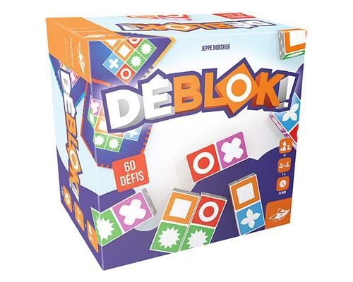 Déblok !, cest un savant mélange dobservation, de rapidité, de logique Et de frénésie ! Chaque joueur dispose de 5 blocs qui comportent chacun 8 symboles. Une carte est retournée, qui comporte un schéma. Soyez le premier à le reproduire avec vos blocs ! Déblok possède deux modes de jeu, 60 défis et cinq niveaux de difficulté !