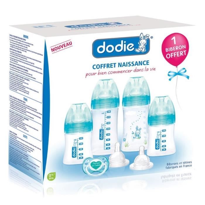 Dodie Coffret Naissance. Composition : 2 x Biberons Initiation+ 150 ml, 2 x Biberons Initiation+ 240 ml, 1 pack de 2 tétines Easy air débit 1, une sucete 0-6 mois.