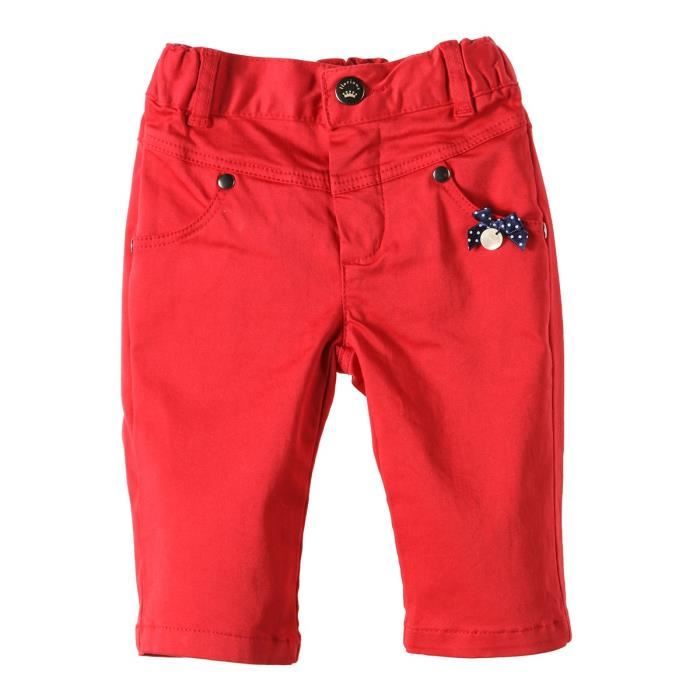 Pantalon rouge 4 poches. Petit noeud fantaisie a pois sur poche avant gauche. Taille élastiquée.