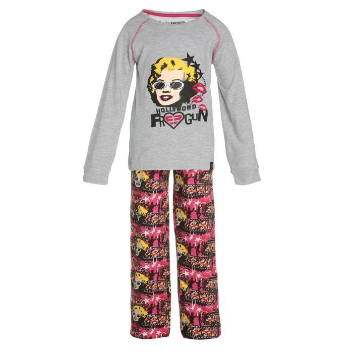 Pyjama 2 pieces 100% coton. T-shirt gris col arrondi. Manches longues. Pantalon taille élastiquée avec motifs.