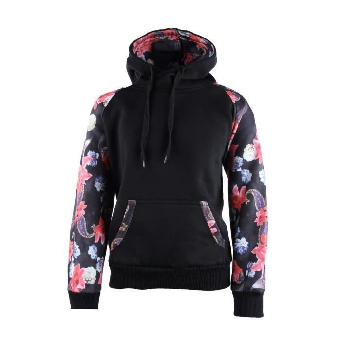 Sweat a capuche, 65 % polyester, 35 % coton, noir. Bords en côtes, manches longues imprimées fleurs.