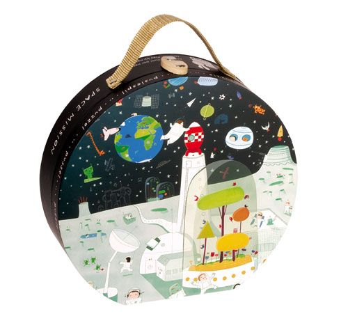 Puzzle de 100 pièces, sur le thème de l'Espace, présenté dans une jolie valisette ronde, facile à transporter grâce à sa poignée.