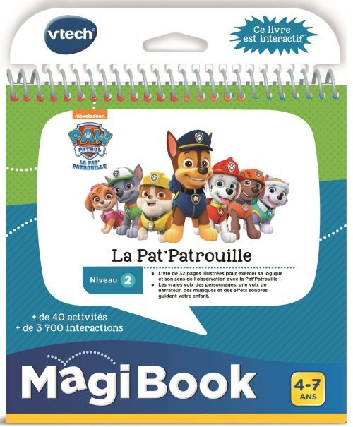 Compatible avec la plateforme éducative MagiBook. Livre de 32 pages illustrées pour faire le plein de découvertes avec tes héros de la Pat´ Patrouille. Des chansons, musiques et plein de voix amusantes pour guider l´enfant. Avec les vraies voix des personnages. Des autocollants inclus que l´enfant colle dans son tableau des récompenses au fur et à mesure qu´il progresse dans le livre et dans ses apprentissages. Contenu audio à télécharger en connectant la plateforme MagiBook à l´ordinateur