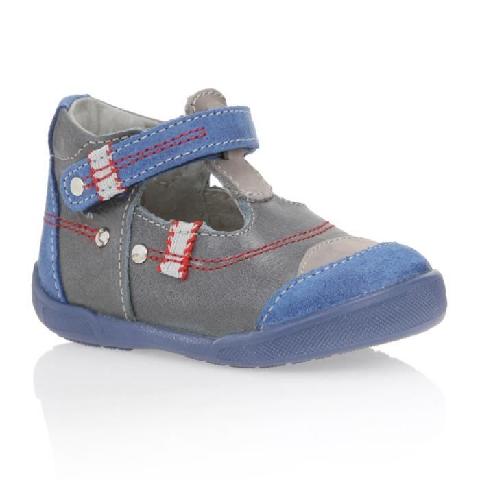 Babies en cuir avec surpiqûres contrastantes, coloris gris et bleu. Fermeture par bride scratchée.