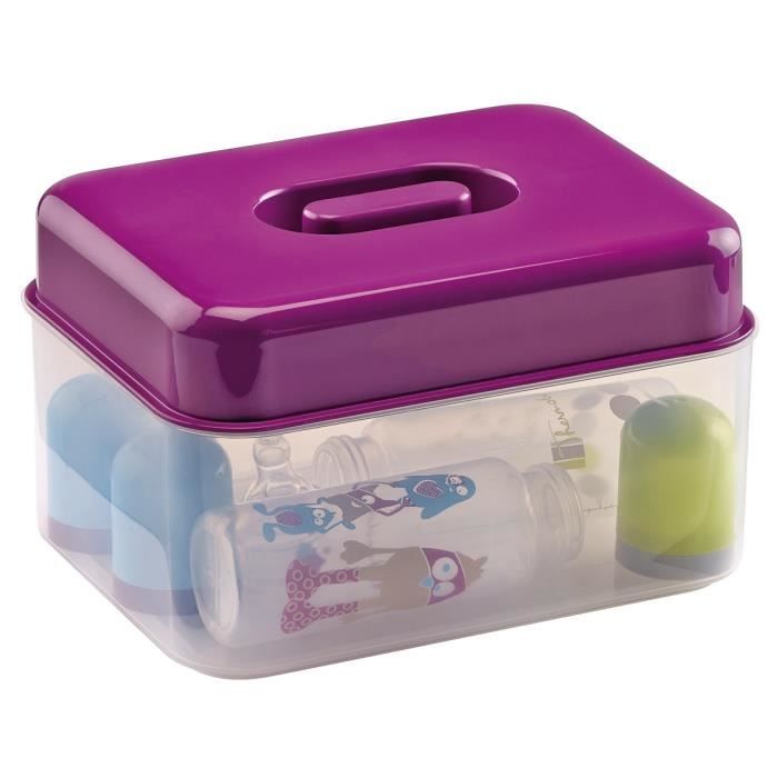 Au micro-ondes : en quelques minutes, pour 4 biberons et accessoires. Chauffage a la vapeur a 100°C. A froid :Détruit les bactéries par une solution chimique, efficace pendant 24h.Grille porte accessoires, cuve spéciale micro-ondes et couvercle fournis. Des la naissance - Garçon et fille - Livré a l'unité