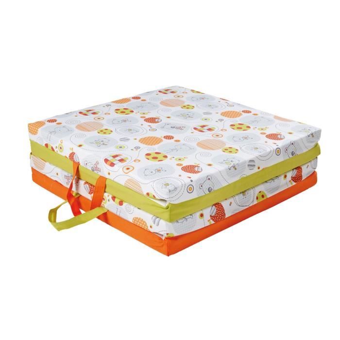 3 en 1 : Déplié pour une aire de jeu. Plié en 2 pour un matelas d'appoint pour lit 60x120cm. Plié en 4 pour un pouf. Poignées de transport intégrées. Déhoussable. Dessous en PVC. Des la naissance - Garçon et fille - Livré a l'unité