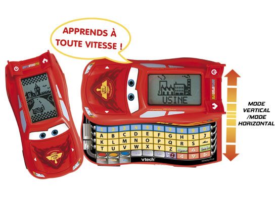 Cars 2-Genius Pocket Cars (4 7 ans) Super, Flash Mc Queen se transforme en ordinateur éducatif de poche (en faisant coulisser la partie supérieure de la voiture) Un ordinateur de poche parlant avec écran LCD animé, 26 touches lettres (clavier abécédaire), 10 touches chiffres et flèches directionnelles. 20 activités réparties en 2 modes de jeu : - Un mode Apprentissage en position horizontal pour explorer 16 activités éducatives et découvrir les lettres, 26 mots, les chiffres, le calcul et la logique. - Un mode Course en position vertical pour accéder à 4 jeux de course 2 orientations décran : vertical et horizontal Un clavier coulissant 3 piles LR6 fournies