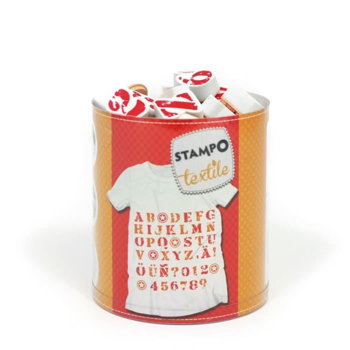 45 tampons pour textile en mousse. Theme: alphabet et chiffre. Les encreurs sont spécialement dédiés a la décoration et a la customisation textile, couvrants, ils se fixent au fer et se lavent ensuite a 40° en machine.