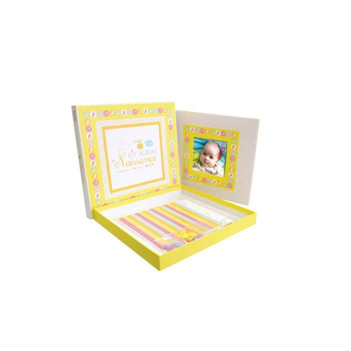 Kit scrapbooking album naissance. Comprenant boîte cartonnée, album 30x30 cm avec 10 pochettes plastiques, 10 feuilles papier 30x30 cm(5 dessins), 3 feuilles d'autocollants (cadres, mots, coins), 1 feuille alphabet autocollant, 4x1m ruban satin, 12 boutons, 6 noeuds tissu, 4 attaches parisiennes et 20 mini attaches parisiennes.