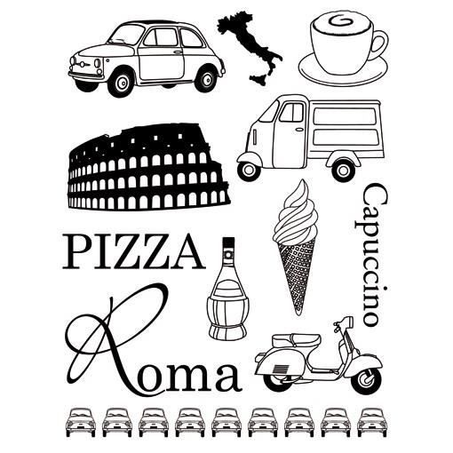 Set 12 tampons transparents Rome : cappuccino, huile d'olive, pizza. En silicone transparent, ils s'appliquent sur un bloc acrylique: vous pourrez ainsi voir par transparence où vous tamponnez ! Se nettoient a l'eau et au savon et s'utilisent uniquement avec des encreurs.
