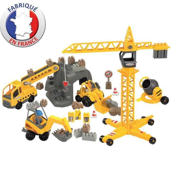 Ecoiffier - Carriere + véhicules TP Abrick - Garçon - Dans la carriere Abrick, la grue souleve les blocs de pierre, le tapis roulant mécanique les descend de la montagne, le buldozer et la pelleteuse les transportent et creusent et la bétonniere tourne en continu. Fabrication française - A partir de 36 mois - Livré a l'unité