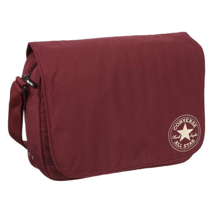 Besace en polyester bordeaux, fermeture par zip et rabat scratché. Une bandouliere ajustable. Un compartiment principal et une poche au dos zippée. Dimensions: 31*38*16 cm.