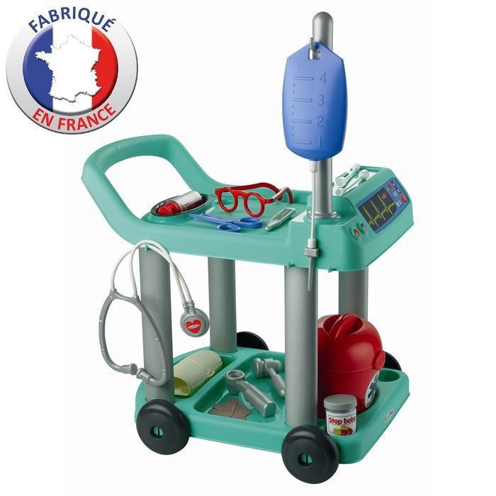 Ecoiffier- Un chariot avec un mât pour pendre la perfusion, un plâtre, des ciseaux, un stéthoscope et tous les accessoires pour soigner y compris une paire de lunettes pour le docteur. Fabrication française. Mixte . A partir de 2 ans. Livré a l'unité.