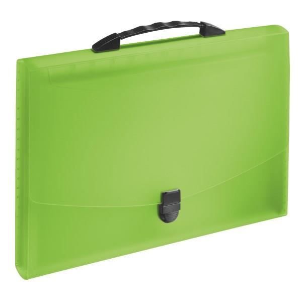 Valisette a soufflet VIVIDA opaque a poignée rigide. Idéale pour le transport de document avec facilité. Composée de 12 compartiments extensibles. Fermeture par systeme de clip. Dimensions (LxHxP) 30 x 260 x 390 mm. Couleur Vert.