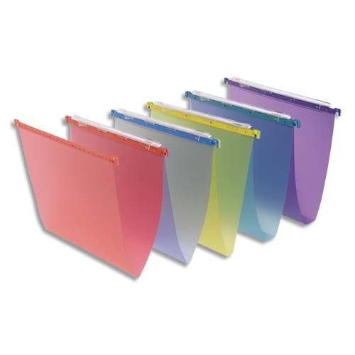 Jupe en polypropylene translucide 5/10e Suspension par tringle plastique Porte-étiquette a effet loupe Mise en continu par volet d'agrafage et bouton pression intégré dans le crochet Entraxe 33 cm Coloris assortis : bleu, jaune, rouge, violet, vert Boîte de 10