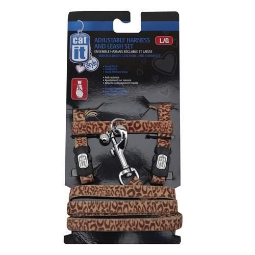 Ensemble harnais réglable & laisse Catit Style, motif Animal. Dim harnais : cou, L. 20-35 cm corps, l. 8 mmxL. 35-50 cm. Dim laisse : l. 8 mmxL. 1,2 m. Nylon anti-accrocs résistant. Harnais muni de curseurs pour un ajustement sur mesure et d'un grelot. Anneau en D pour y attacher la laisse et une plaque d'identification.