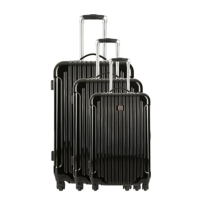 Set de 3 valises trolley 4 roues ultra-maniables en ABS noir. Trois formats : cabine, intermédiaire et maxi. Bouton poussoir sur poignée télescopique ajustable en hauteur. Poignées de portage latéral et supérieur. Ouverture zippée a double curseur + cadenas a code intégré. Un compartiment avec plateau séparateur, double sangle élastique de maintien intérieur.