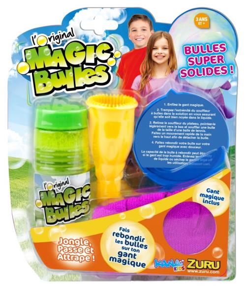 Avec Magic Bulles, jongle avec des bulles à l'infini. Mets le gant fourni et fais une bulle avec le mélange magique de Magic Bulles. Boing ! Boing ! Voilà, tu jongles avec la bulle en la faisant rebondir sur ta main. Tes copains n'en croient pas leurs yeux ! Avec Magic Bulles, deviens le magicien des bulles !